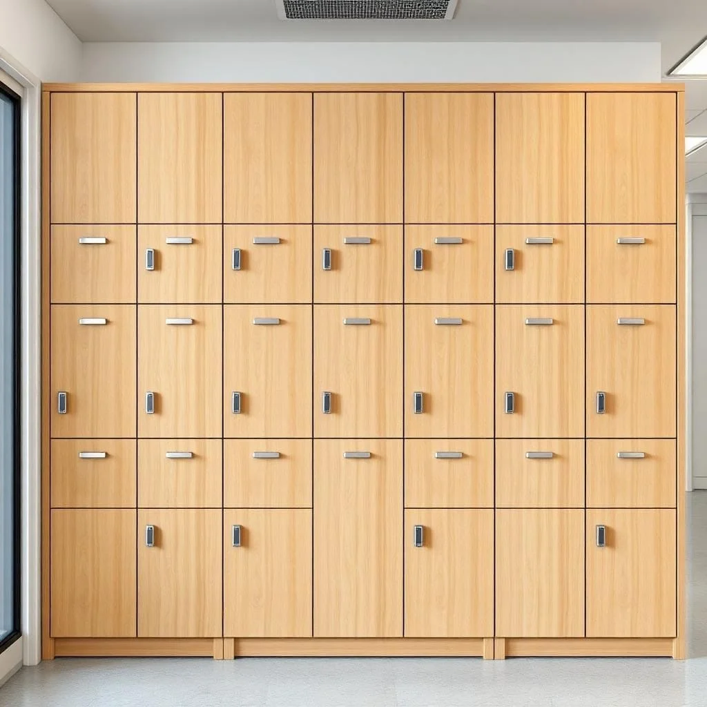 Tủ locker gỗ công nghiệp có ưu điểm là bề mặt phẳng, màu sắc đẹp, tạo cảm giác sang trọng và đồng bộ với nội thất. Chất liệu này phù hợp cho văn phòng cao cấp, khách sạn, resort hoặc khu vực tiếp khách, nơi yêu cầu thẩm mỹ cao hơn công năng thuần túy.